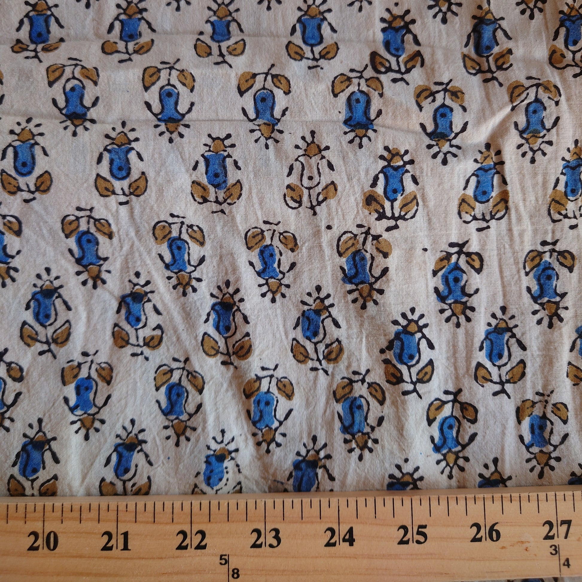 The floral design is hand block-printed on 100% lightweight cotton. This fabric was hand-printed using the mud resist technique by artisans in Rajasthan, India. Given the handmade nature of this fabric, slubs, color uneven-ness, and overall "flaws" are expected and add to the charm of the piece.