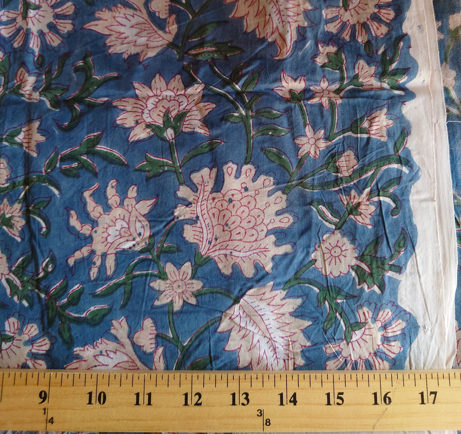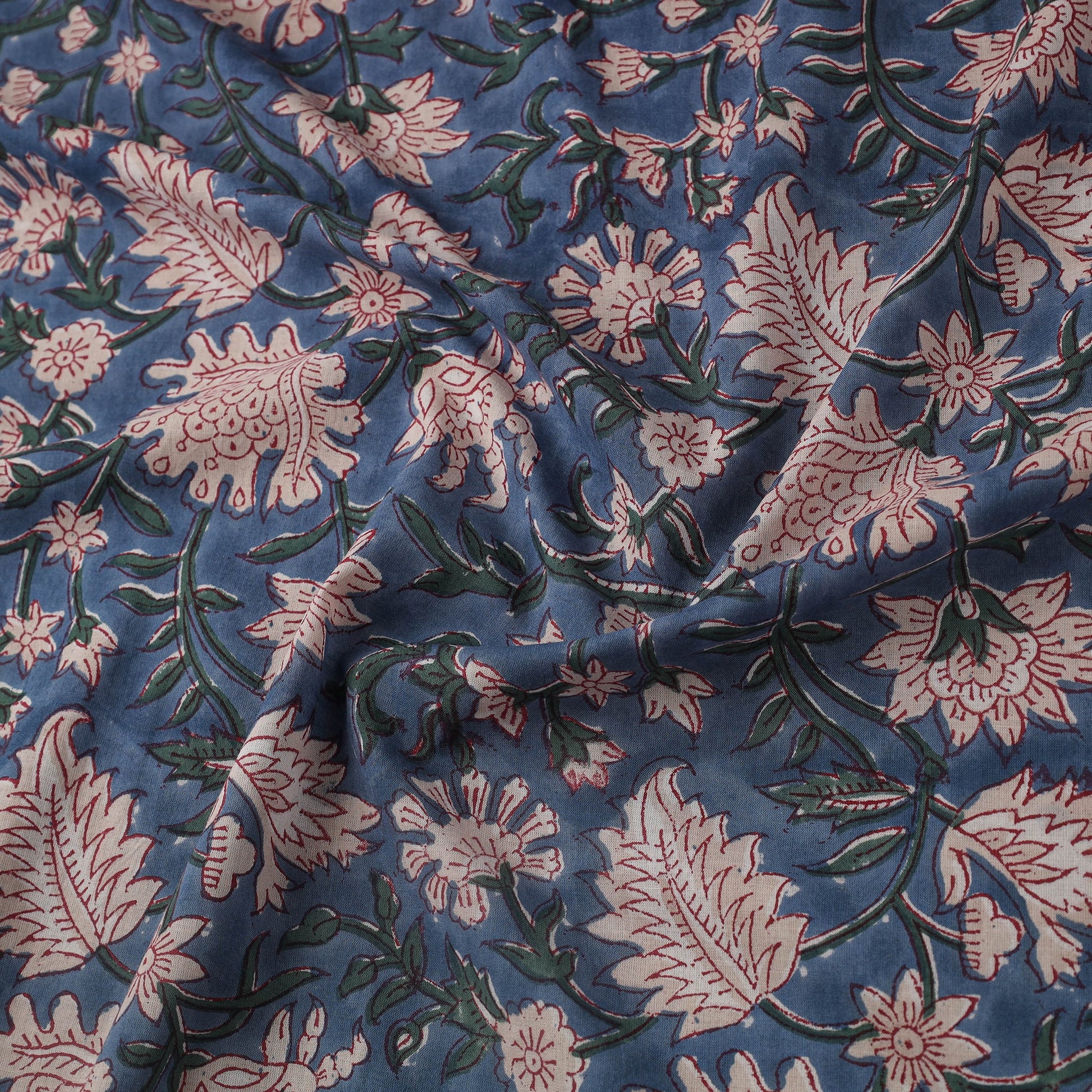 The sanganeri floral motif is hand block-printed on 100% lightweight cotton. This fabric was hand-printed by artisans in Rajasthan, India. Each color is separately printed using wooden blocks using Azo-Free dye. Given the handmade nature of this fabric, slubs, color uneven-ness, and overall "flaws" are expected and add to the charm of the piece.