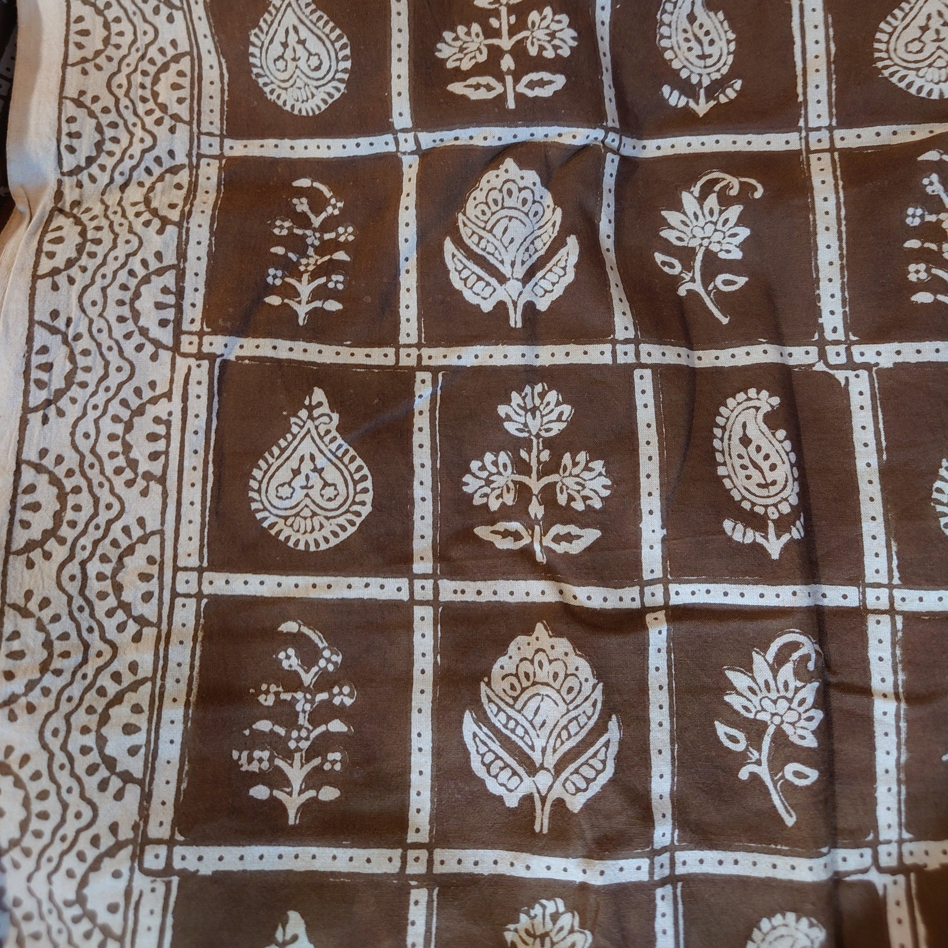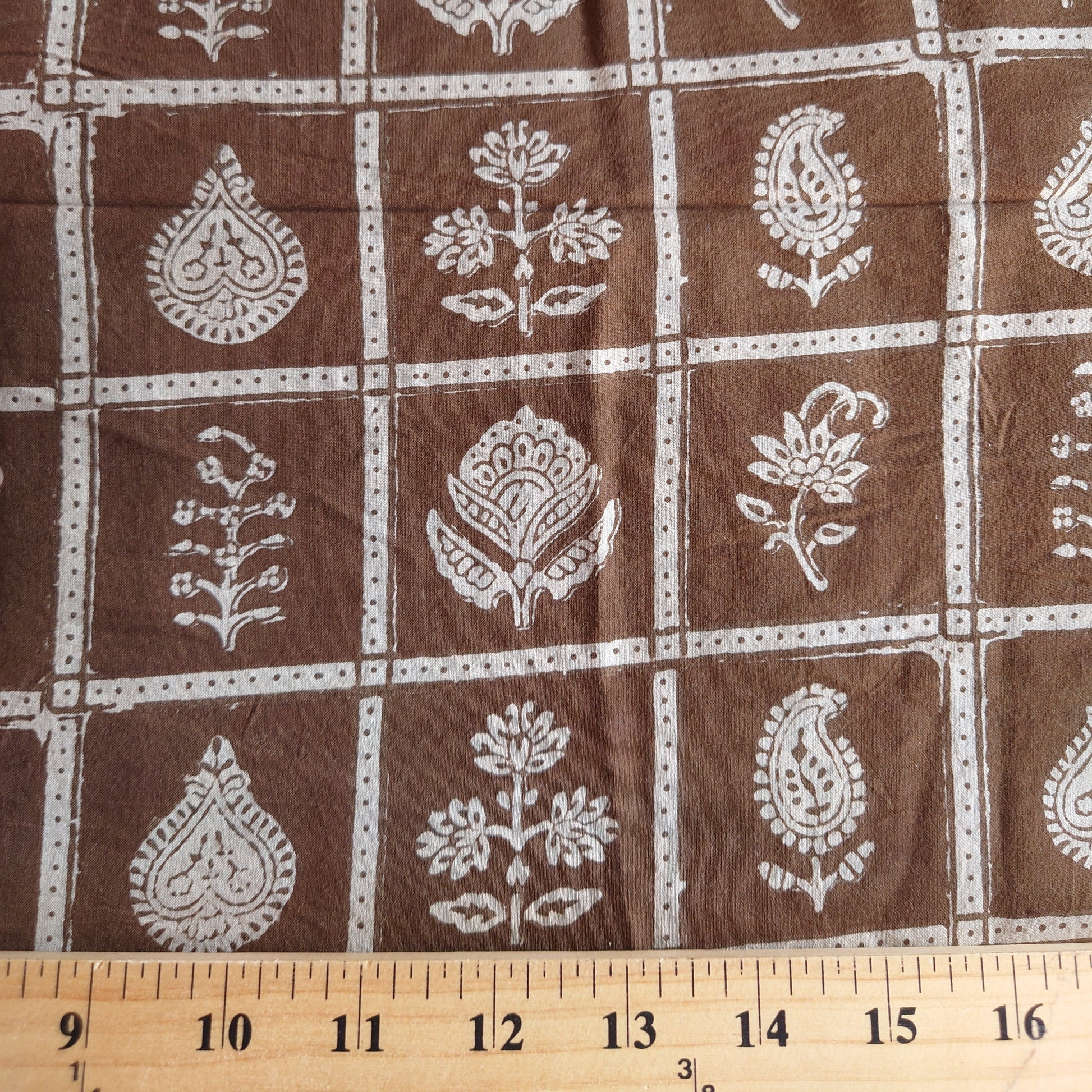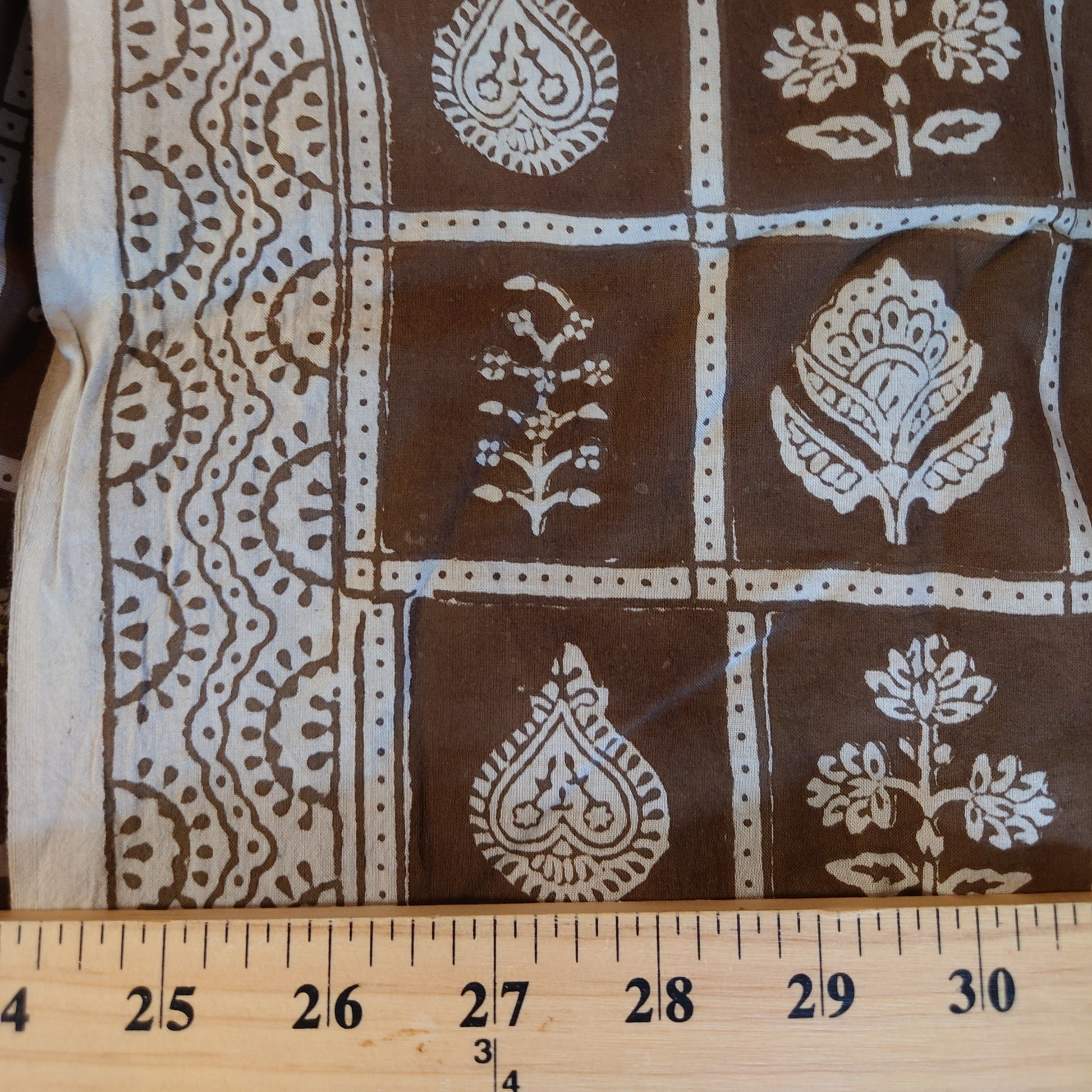 Hand block-printed on 100% lightweight cotton, this design features a florals in a checker pattern reminiscent of henna or mehendi. There is a decorative border along only one of the selvedges. This fabric was hand-printed using the mud resist technique by artisans in Rajasthan, India. Given the handmade nature of this fabric, slubs, color uneven-ness, and overall "flaws" are expected and add to the charm of the piece.